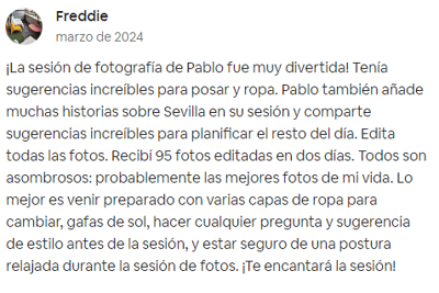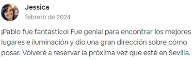 "¡Pablo es muy amable y encantador, también profesional para ver cada momento para la gran foto! Muy recomendable si estás buscando una sesión de fotos en Sevilla 🙂 "